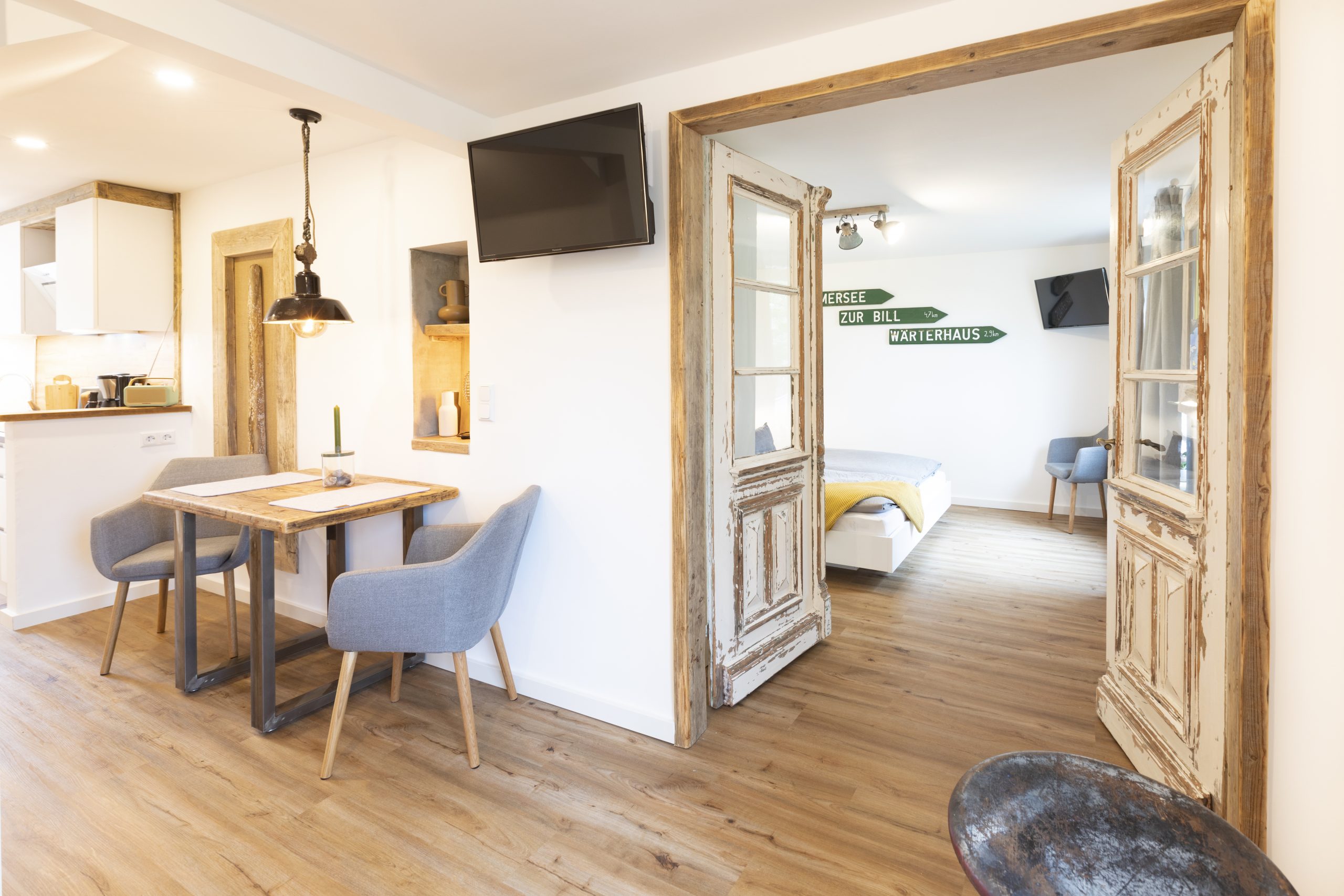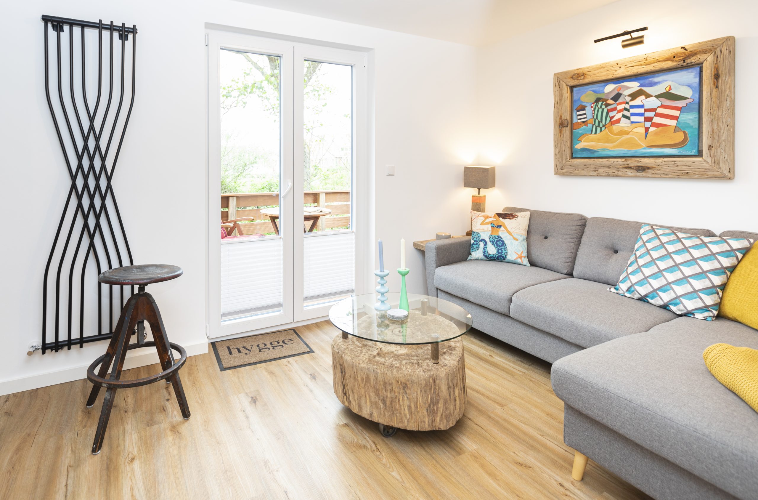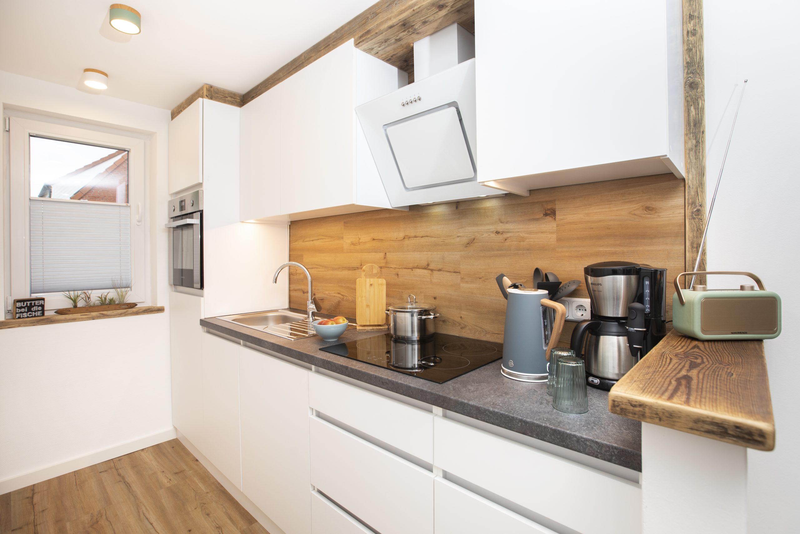 Der individuelle Faden zieht sich durch die kleine Wohnung, die mit viel Liebe und Sorgfalt umgebaut, kreativen Strandfunden eingerichtet und einem Händchen für Holz vollendet wurde, um die Wünsche an einen unbeschwerten Urlaub mit der Harmonie von einem Stück Juist – Heimeligkeit zu verbinden.